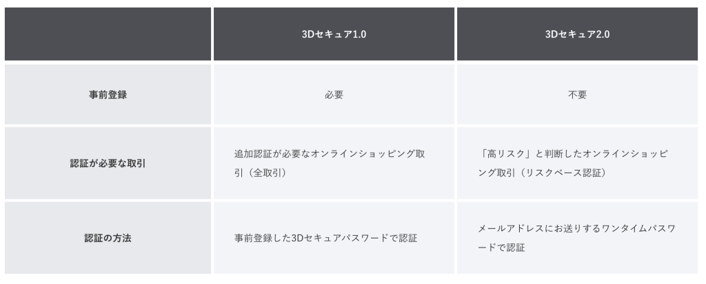 - オンラインショッピングでの決済:支払い時にカード情報を入力すると、3Dセキュア認証が自動的に適用されます。この際、加盟店が3Dセキュアに対応している必要があります。対応していない場合は通常のクレジットカード決済が行われますが、セキュリティレベルが低下することが考えられます。