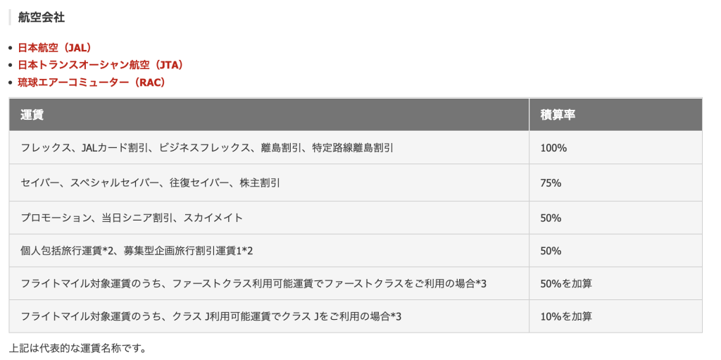 国内線の場合は以下になっており、例えば楽天トラベルやじゃらんなどの航空券付きプランを選んで旅行を計画していたり、JTBなどの店舗のパッケージプランでJALに搭乗した際には、「個人包括旅行運賃、募集型企画旅行割引運賃」となるため、積算率は50%となります。