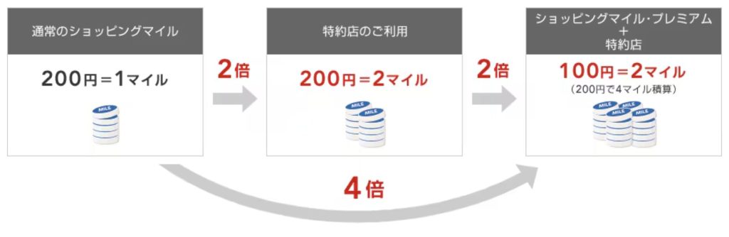| ショッピングマイル・プレミアム | 100円=1マイル (年会費:4950円/税込)入会の場合 | |||||