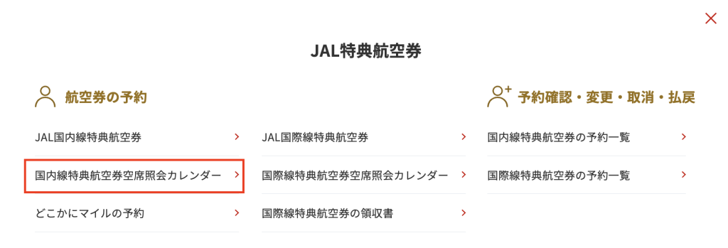 その後、「国内線特典航空券空席照会カレンダー」を選択。