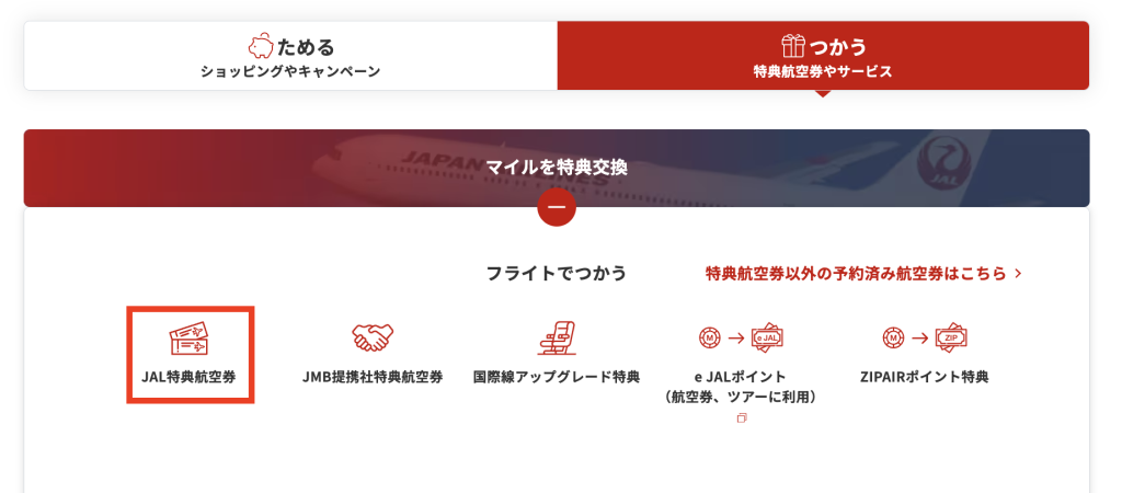 その後、下の方に行き「使う(特典航空券やサービス)」を選択し、「JAL特典航空券」を選択してください。