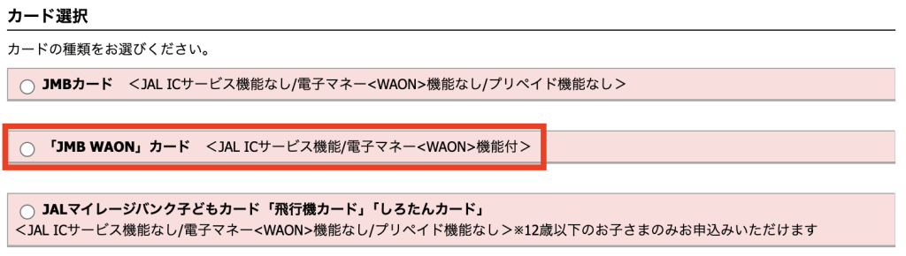 JALマイル還元の効率を良くするため、「JMB WAONカード」がおすすめです。筆者は登録時にただのJMBカードにしたので、後から「JMB WAON」に切り替え手続きをしました。。