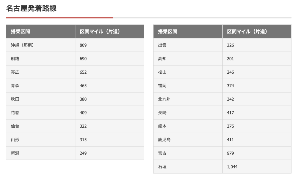 例えば、名古屋(セントレア)から沖縄(那覇空港)までは片道809マイルが区間マイルであることがわかります。