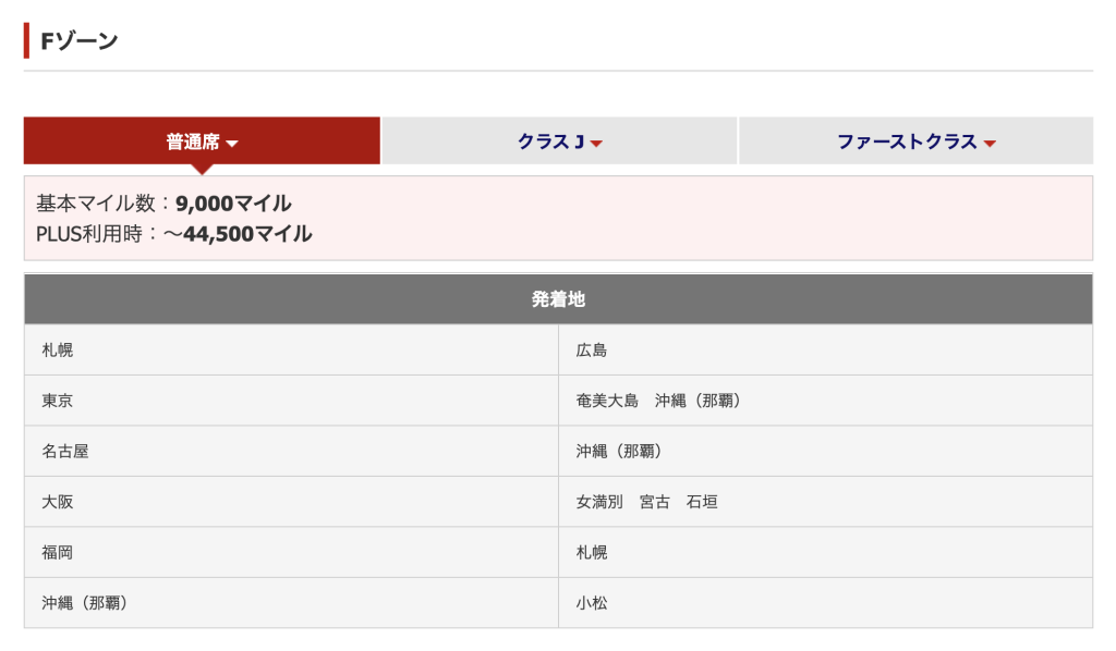 たとえば、東京や名古屋から沖縄(那覇)まで特典航空券を利用する場合、Fゾーンとなり、必要マイル数は9000マイルとなります。