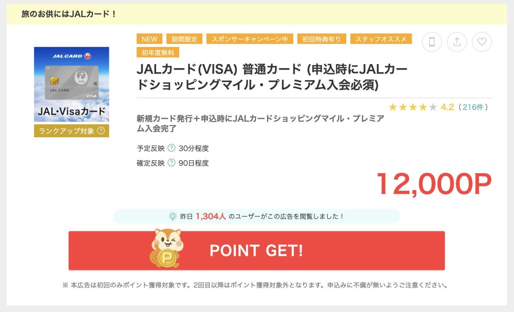 例えば、JALカードを申込する場合は、以下のようにモッピー経由で申し込みすると、モッピーでのポイントが12000ポイント貯まりますし、JALカードのキャンペーンでもマイルが貯まります。