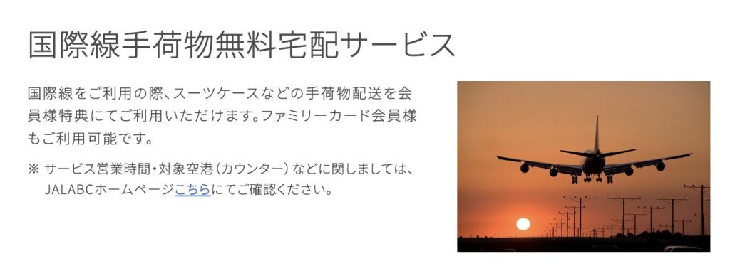国際線だけですが、スーツケースを1つ無料で自宅から空港、空港から自宅まで宅配してもらえます。交通手段が電車の人は特にありがたいですね。