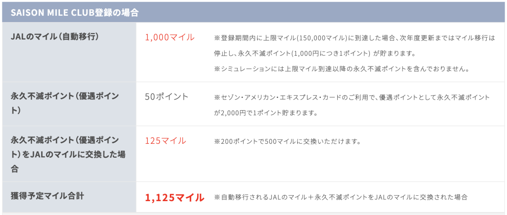 | ポイント還元率(JALマイル) | 最大1.125% ※SAISON MILE CLUB (年会費5500円)入会の場合 |
